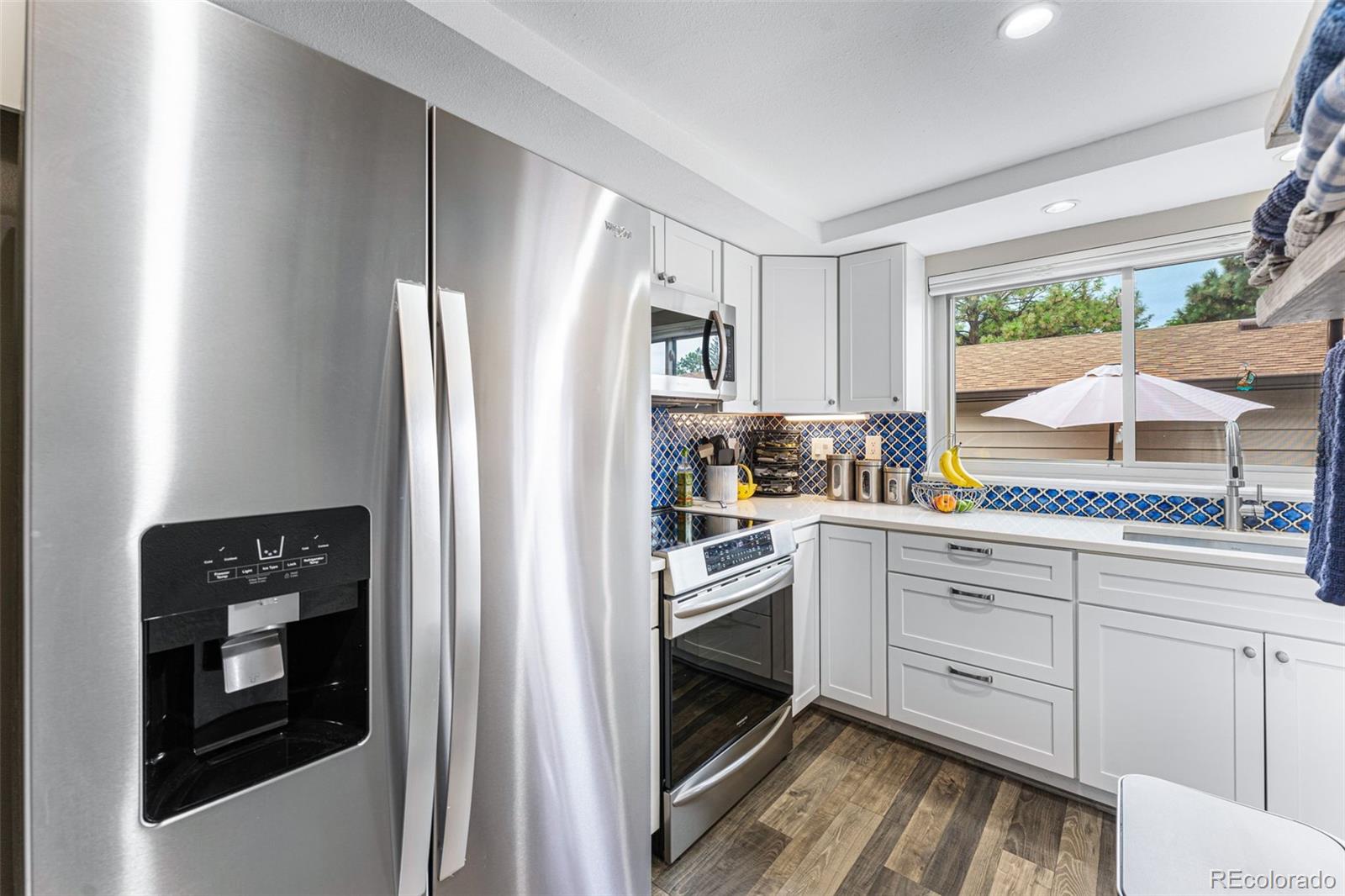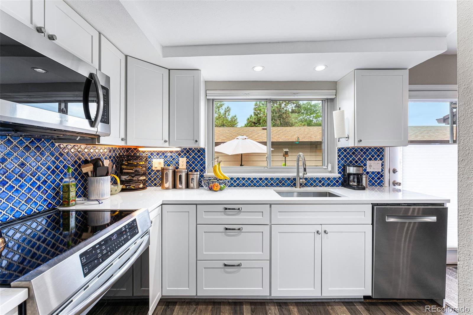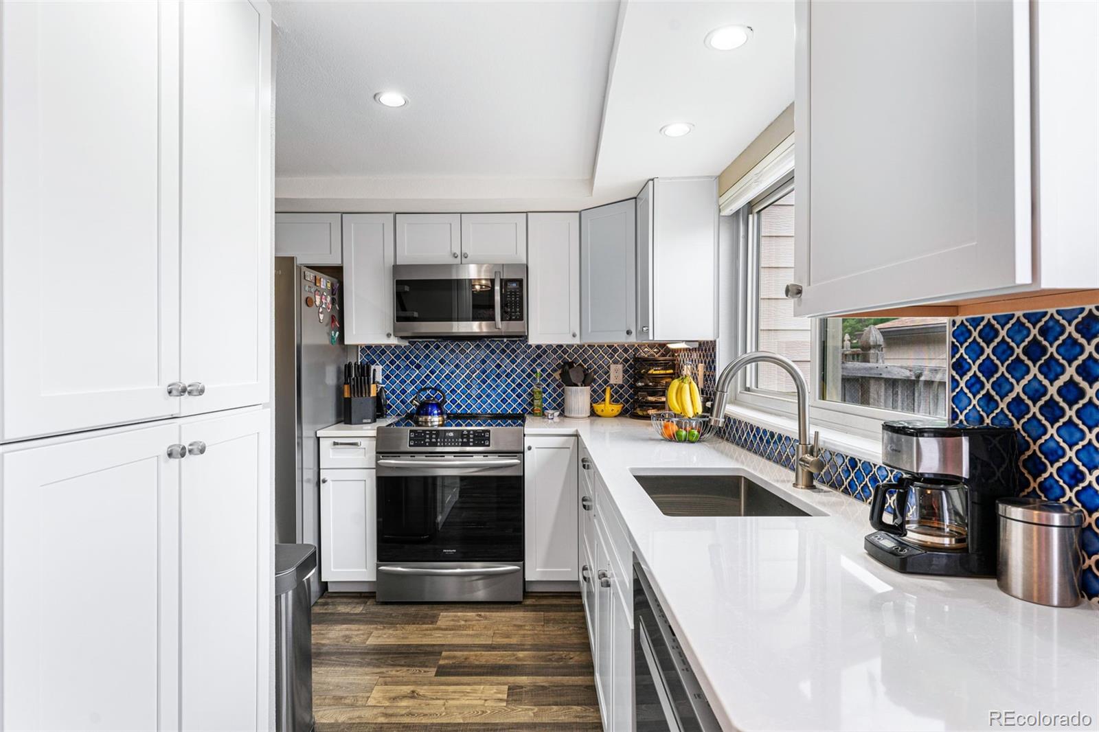 Preferred Lender offering LENDER PAID temporary buy-down. Reach out to Listing Agent for more details. Step into this beautifully updated 1,644-square-foot townhome that effortlessly combines modern elegance with a warm, inviting atmosphere. Perched on a tranquil hilltop, this home enjoys an abundance of natural light, highlighting the sleek new flooring and fresh, contemporary paint throughout. The open-concept living space flows seamlessly from the bright and airy living room to the dining area, perfect for both everyday living and entertaining. The kitchen is a true showstopper, featuring stunning quartz countertops, crisp white cabinetry, and high-end stainless steel appliances. A striking blue tile backsplash adds a pop of color, making the kitchen as functional as it is stylish. Beyond the interior, you'll find a private back patio, ideal for outdoor relaxation or hosting guests. The home also offers the convenience of a spacious two-car garage and a finished basement that provides the flexibility to create a third bedroom or additional living space. Located within Cherry Creek School District and just minutes from shopping, the Denver Tech Center, and the scenic Cherry Creek Reservoir, this townhome offers easy access to urban amenities while being within walking distance to the peaceful Mission Viejo Park. Truly turn-key and move-in ready, this home is a rare find in a sought-after location.
