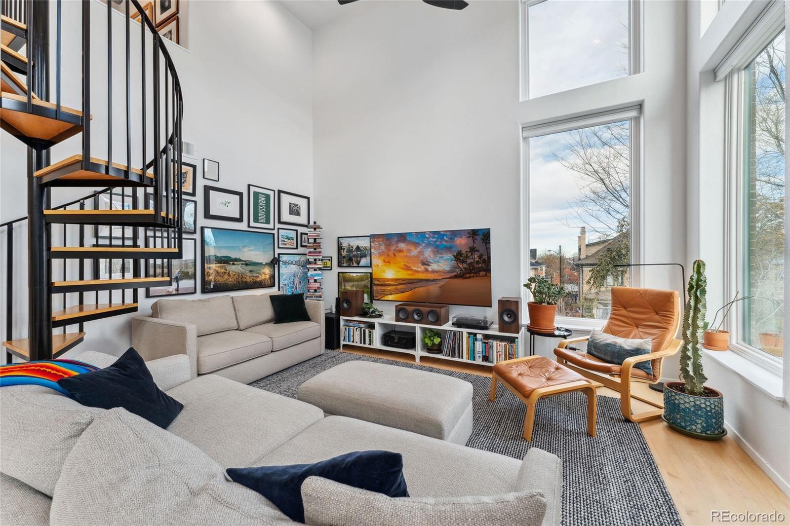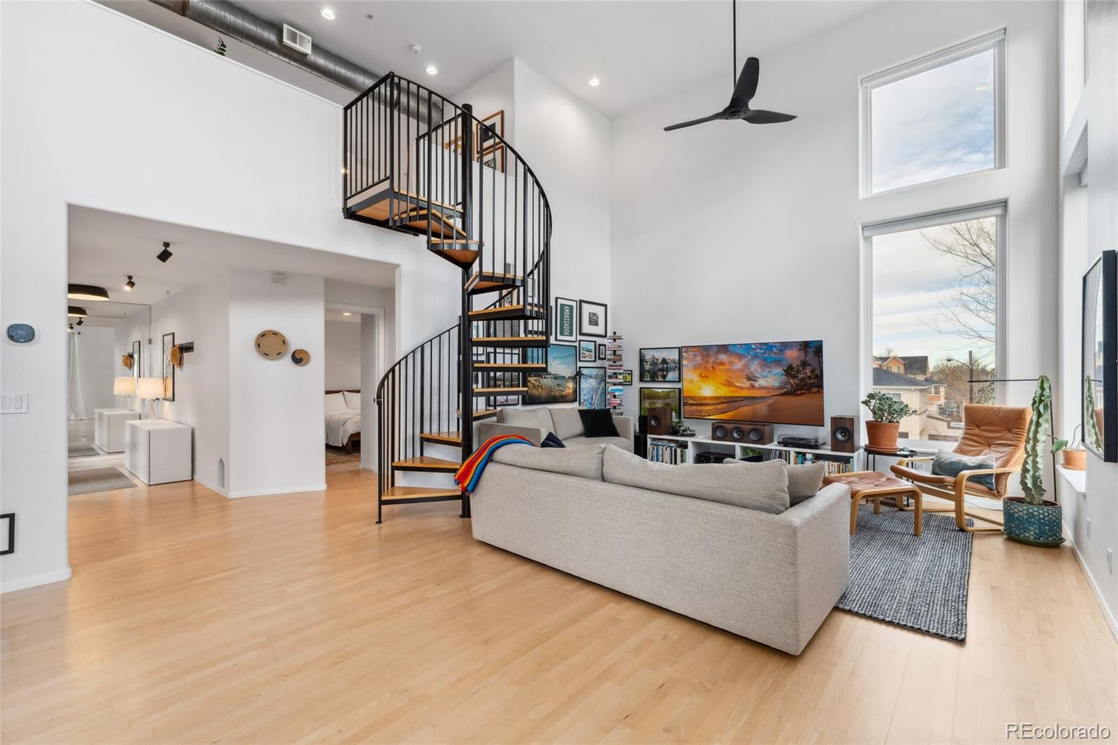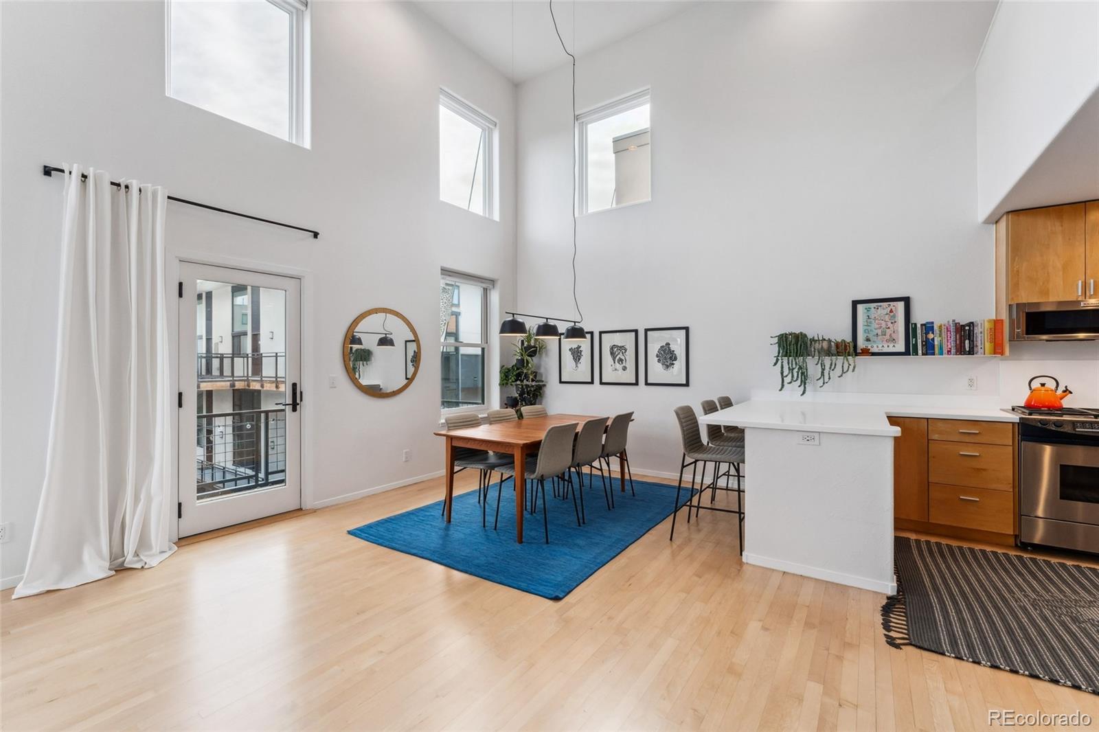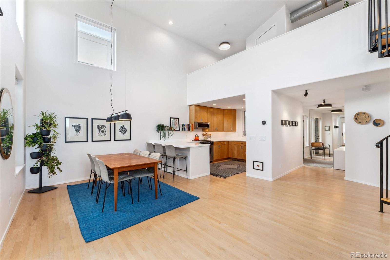 This exceptional condo in the sought-after Capitol Hill neighborhood offers an unmatched combination of modern updates, walkability, and serene living. Located within easy walking distance of grocery stores, coffee shops, and restaurants, this home is also conveniently close to Cheesman Park, the Denver Botanic Gardens, and downtown Denver. Proximity to I-25 & 6th Ave ensures seamless connectivity for commuting and travel. The grand open floor plan features soaring two-story ceilings, filling the home with abundant natural light. Morning sunlight is particularly striking, while the surrounding summer greenery creates a treehouse-like ambiance. Maple hardwood floors and a crisp, clean color palette flow through the living room, dining nook, and kitchen, with a private balcony off the dining area perfect for outdoor dining. The main level includes a spacious bedroom with a nearby full bath. Upstairs, the loft-style primary suite features its own private balcony and a versatile hallway flex space ideal for a home office or yoga retreat. Recent updates make this home truly move-in ready, including a fully renovated master bathroom (2024), new Renewal by Andersen windows and patio doors (2023), and refinished hardwood floors throughout (2020). Additional upgrades include a high-efficiency furnace, SEER 17 AC, smart thermostat, motorized blinds, and an Elfa closet system. The interior also boasts updated lighting, a new garbage disposal, and freshly painted walls. The building itself has been meticulously maintained, with recent projects including a new elevator hydraulic motor (2024), a roof replacement (2021), and resurfaced catwalks (2020). The heated, secure garage provides two parking spaces and a large private storage room, ensuring both convenience and peace of mind. This beautifully updated home is a rare find, offering contemporary comforts, thoughtful improvements, & a prime location in one of Denver's most desirable neighborhoods.