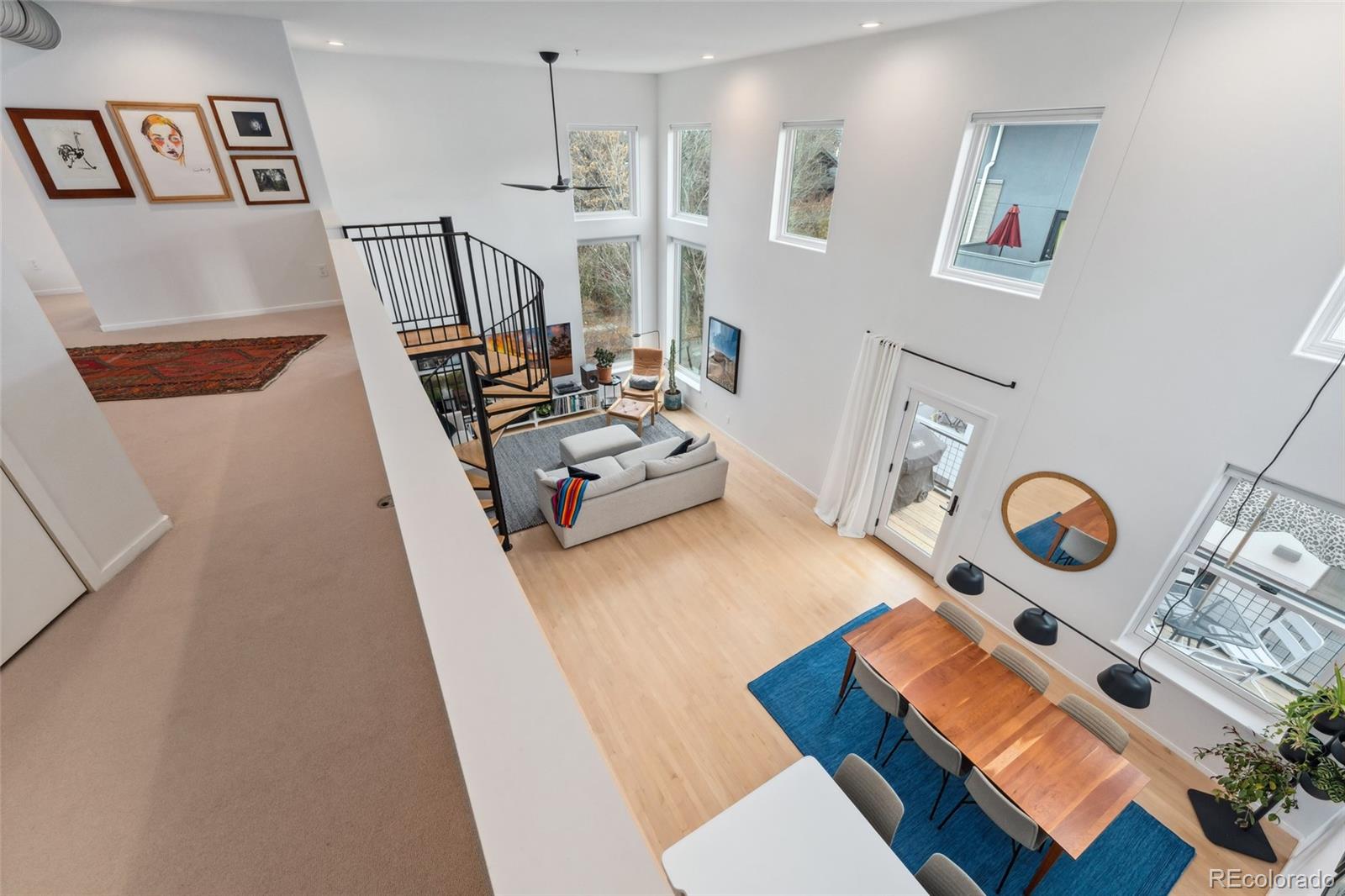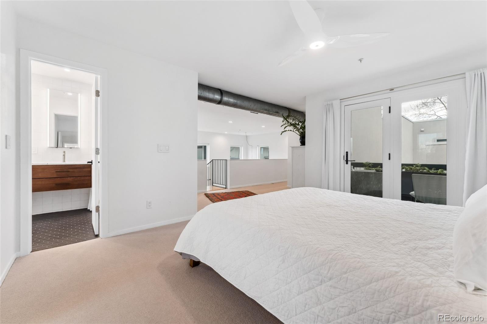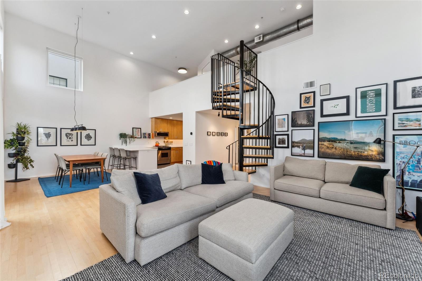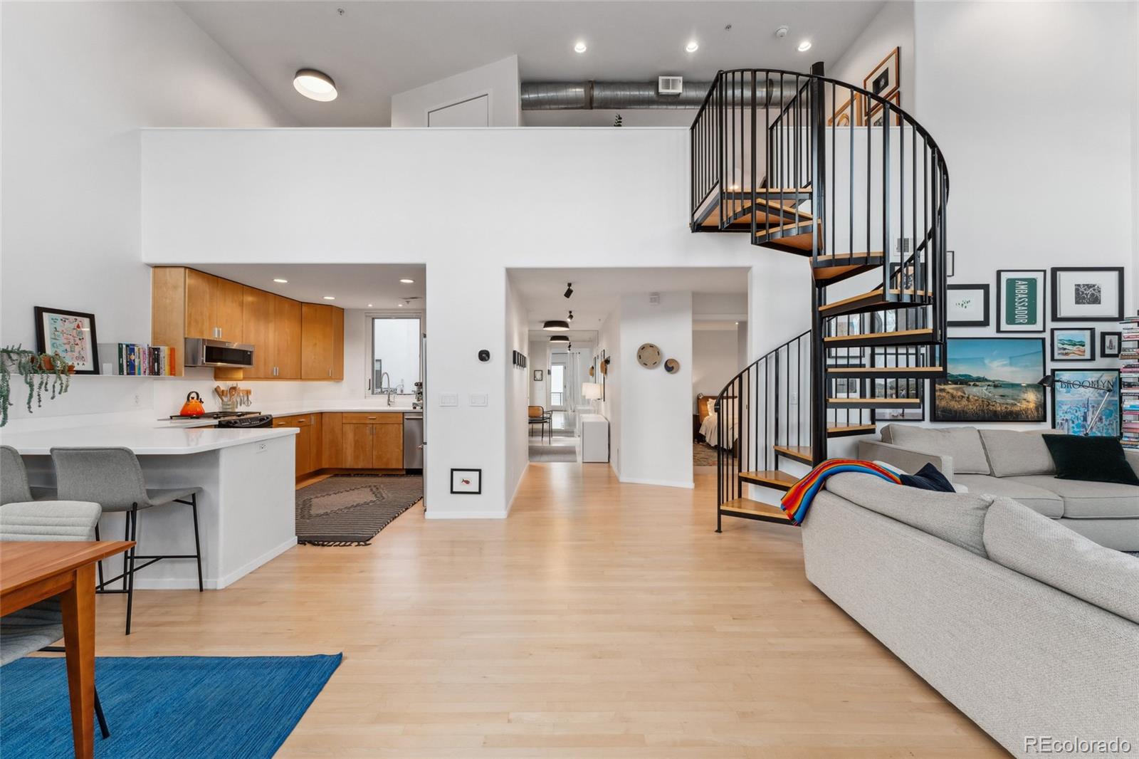 This exceptional condo in the sought-after Capitol Hill neighborhood offers an unmatched combination of modern updates, walkability, and serene living. Located within easy walking distance of grocery stores, coffee shops, and restaurants, this home is also conveniently close to Cheesman Park, the Denver Botanic Gardens, and downtown Denver. Proximity to I-25 & 6th Ave ensures seamless connectivity for commuting and travel. The grand open floor plan features soaring two-story ceilings, filling the home with abundant natural light. Morning sunlight is particularly striking, while the surrounding summer greenery creates a treehouse-like ambiance. Maple hardwood floors and a crisp, clean color palette flow through the living room, dining nook, and kitchen, with a private balcony off the dining area perfect for outdoor dining. The main level includes a spacious bedroom with a nearby full bath. Upstairs, the loft-style primary suite features its own private balcony and a versatile hallway flex space ideal for a home office or yoga retreat. Recent updates make this home truly move-in ready, including a fully renovated master bathroom (2024), new Renewal by Andersen windows and patio doors (2023), and refinished hardwood floors throughout (2020). Additional upgrades include a high-efficiency furnace, SEER 17 AC, smart thermostat, motorized blinds, and an Elfa closet system. The interior also boasts updated lighting, a new garbage disposal, and freshly painted walls. The building itself has been meticulously maintained, with recent projects including a new elevator hydraulic motor (2024), a roof replacement (2021), and resurfaced catwalks (2020). The heated, secure garage provides two parking spaces and a large private storage room, ensuring both convenience and peace of mind. This beautifully updated home is a rare find, offering contemporary comforts, thoughtful improvements, & a prime location in one of Denver's most desirable neighborhoods.