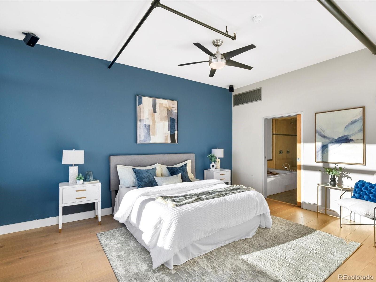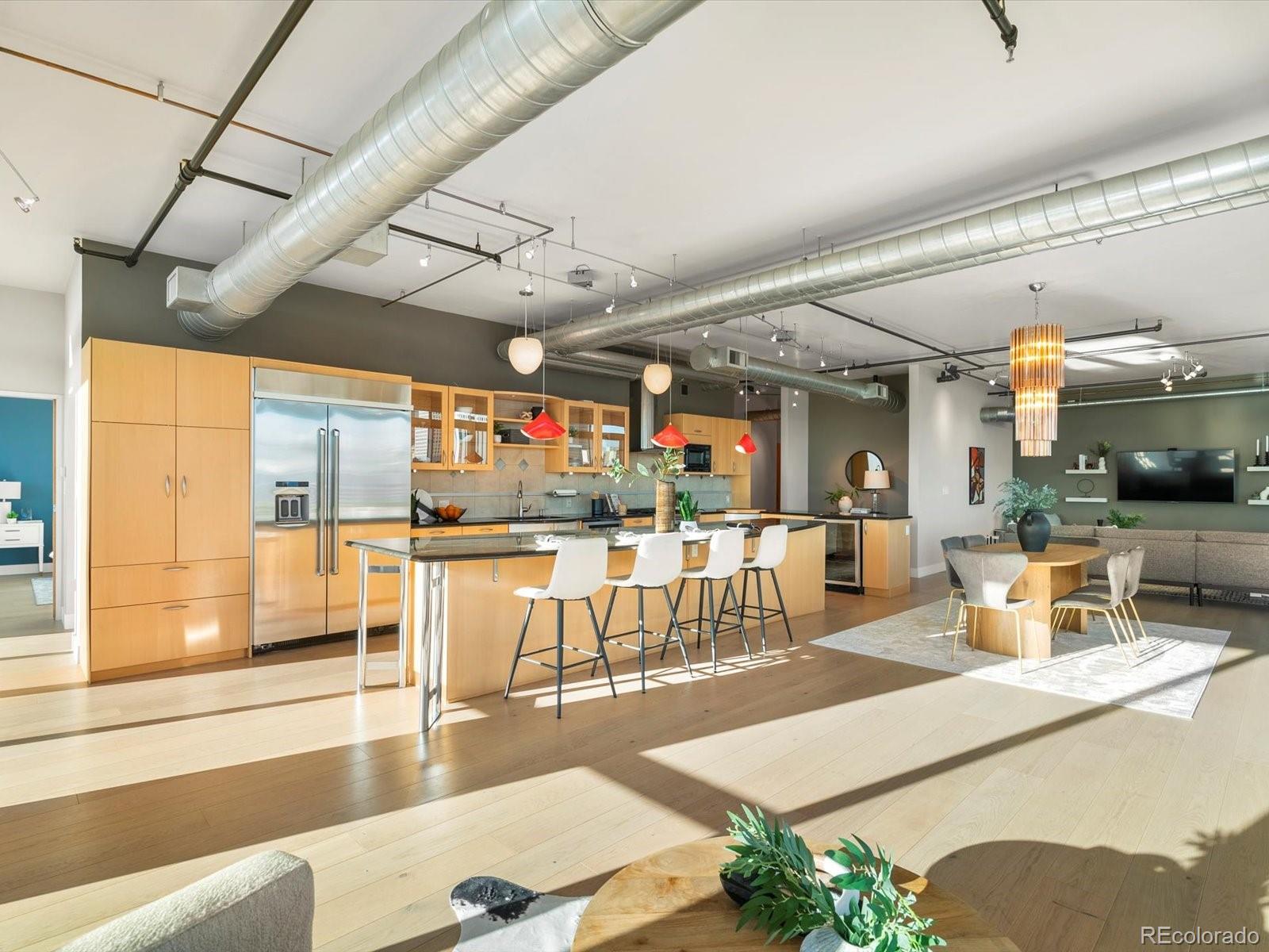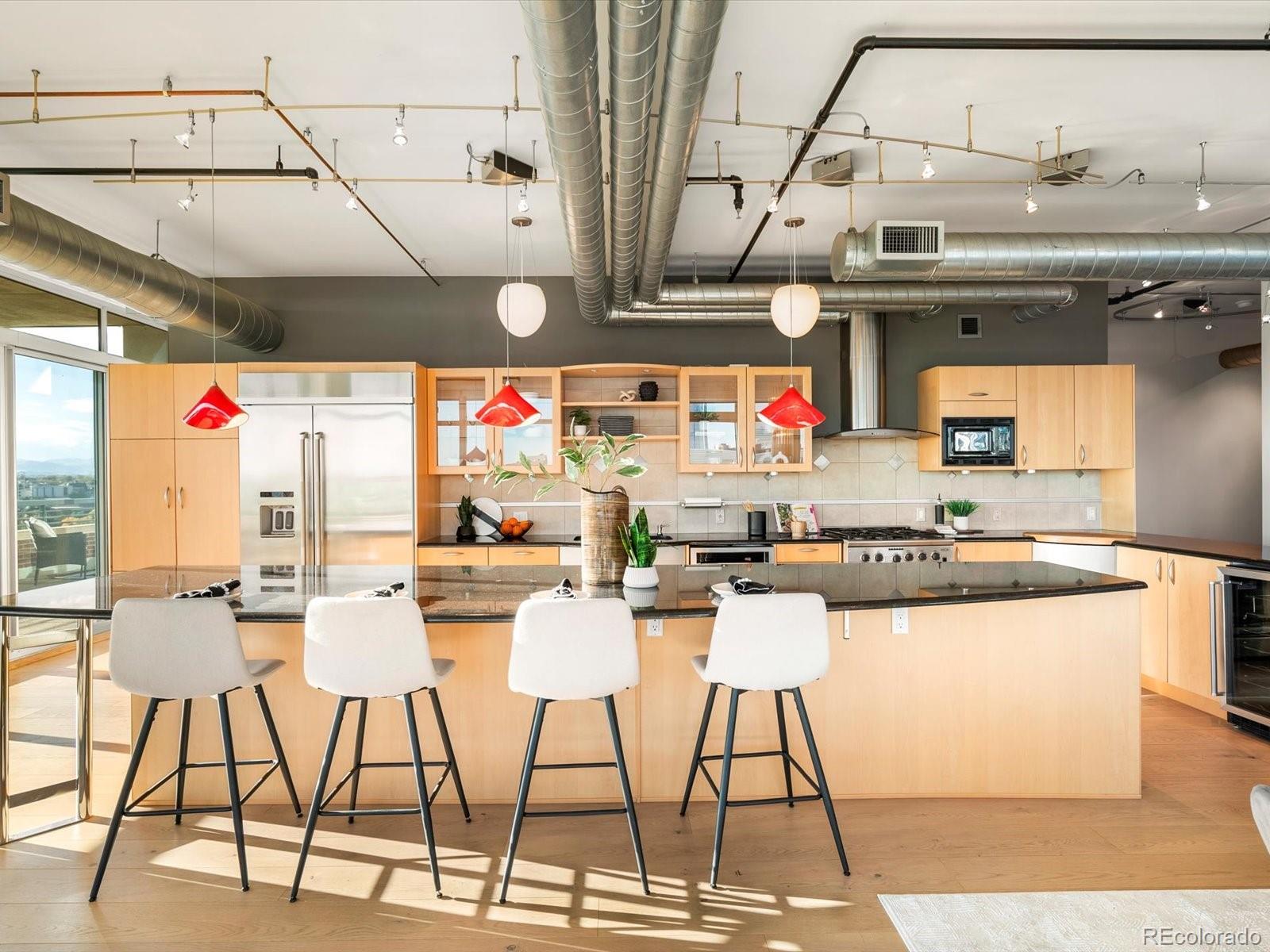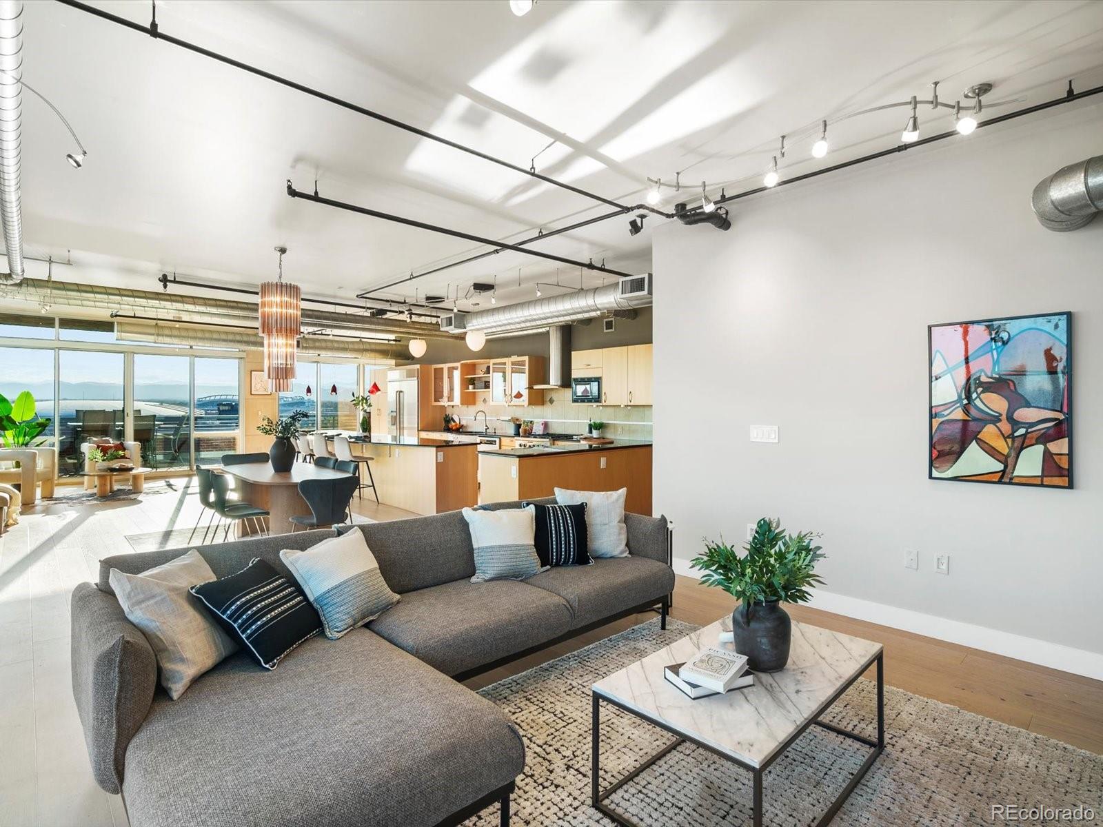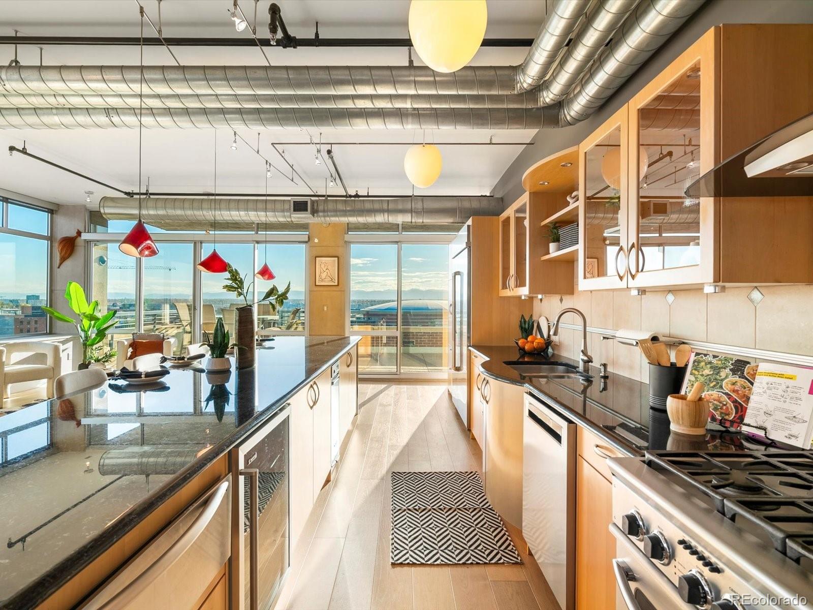Welcome to 1401 Wewatta Street #1203, a stunning corner residence in the coveted Waterside Lofts that defines elevated downtown Denver living. Set on the exclusive 12th floor--shared with only three other units--this expansive unit offers 270o of unobstructed views from the city skyline to the Rocky Mountains. From sunrise coffee to sunset cocktails, every moment is framed by beauty. The open-concept living space features wide-plank oak floors, floor-to-ceiling windows, a dining area, two separate living spaces, and a striking Italian designer chandelier. The chef's kitchen is built for entertaining, centered around a 15-foot granite island with seating for six. It's complemented by premium stainless steel appliances, a warming drawer, two wine and beverage fridges, a trash compactor, glass cabinetry, and open shelving. The primary suite is a serene retreat with breathtaking mountain + city views, a custom walk-in closet with built-in lighting, and a luxurious 5-piece bath featuring dual heads and a jetted soaking tub. The secondary bedroom makes an ideal guest space or home office, adjacent to a contemporary 3/4 bathroom. Incredible outdoor living awaits with two oversized private terraces which adds an approximate additional 1,000 square feet of living space -- an entertainer's dream with sweeping city and mountain views. Outfitted with a gas line, water access, and drainage, these patios truly extend your home to the sky. Additional highlights include three side-by-side parking spaces in a temperature-controlled garage, three large storage units, and a secure access-controlled building with a 24-hour lobby attendant, full security system, business center, and fitness facility. Steps from Ball Arena, Union Station, the Cherry Creek Trail, and Denver's best dining and nightlife, this residence offers an unparalleled blend of luxury, privacy, and connection. Experience the finest in downtown living at Waterside Lofts--Denver's ultimate urban sanctuary.